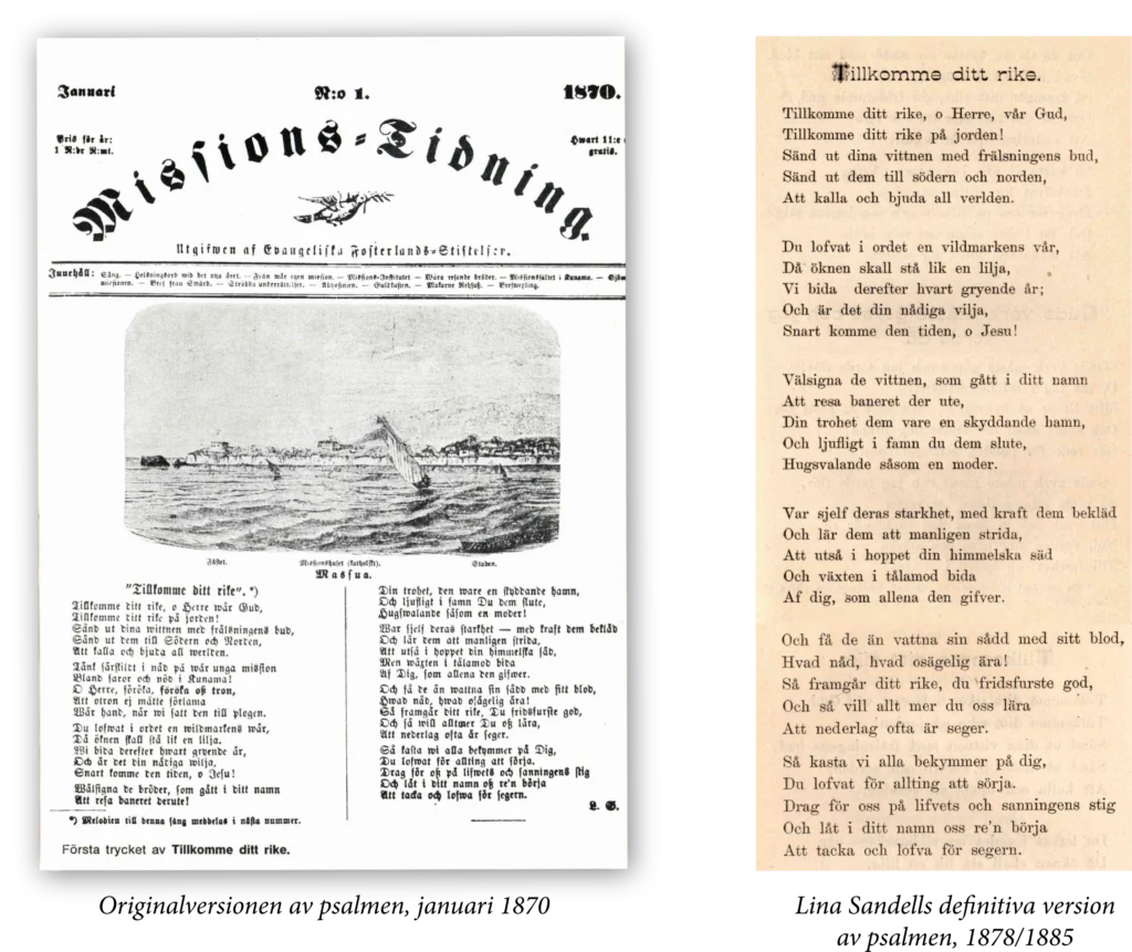 Missionshistoriskt är året 1869 ett viktigt årtal. Då inträffade ett antal dramatiska händelser som ledde till att den svenska kristenheten fick en av sina finaste missionspsalmer: Lina Sandells Tillkomme ditt rike, o Herre, vår Gud, nr 100 i vår nuvarande psalmbok.